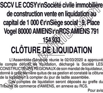 SCCV LE COSY clôture liquidation