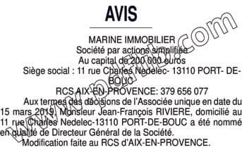 MARINE IMMOBILIER- NOMINATION DG