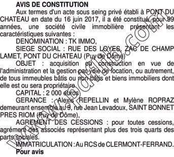 dans le journal L'ANNONCEUR LEGAL D'AUVERGNE