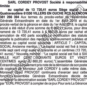 Réduction capital EURL PROVOST