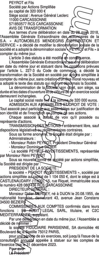 TRANSFORMATION SAS PEYROT etFils