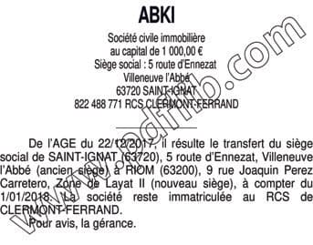 ABKI -TRANSFERT DU SIEGE SOCIA