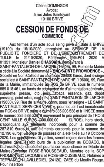 SNC SAINTE PROVIDENCE CESSION