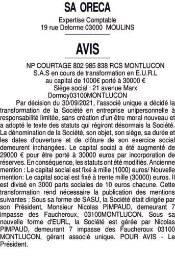 Aug.cap. + transfo. NP COURTAGE