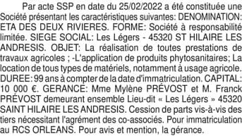 SARL ETA DES DEUX RIVIERES - Loiret (45)