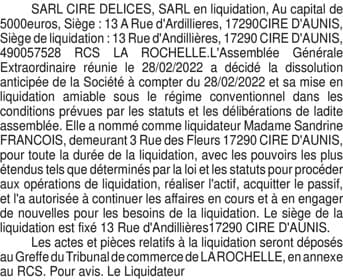 CIRE DELICES_ dissolution
