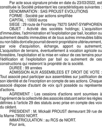 SAS PROUST EVOLUTIONS - Deux Sèvres (79)