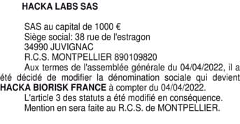 HACKA LABS SAS : Modification