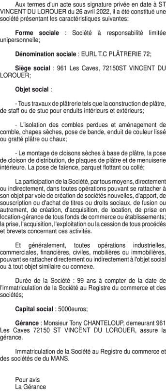 EURL T.C PLÂTRERIE 72 - Sarthe (72)