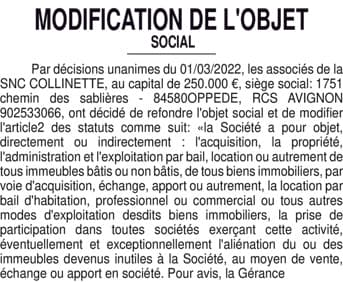 MODIFICATION OBJET SNC