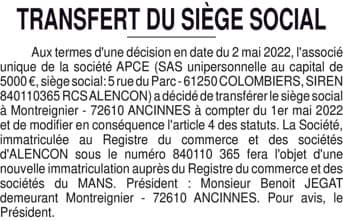 APCE - Transfert de siège