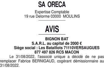 BIGNON BAT- Démission cogérant