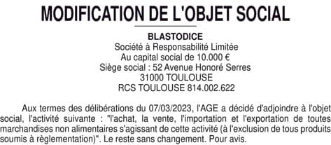 BLASTODICE - MODIFICATION DE L'OBJET SOCIAL