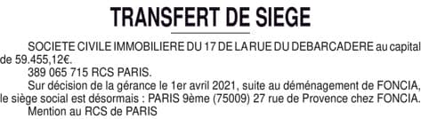 Transfert SCI du 17 DE LA RUE DU DEBARCADERE