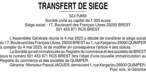 SCI PJKM - TRANSFERT SIEGE