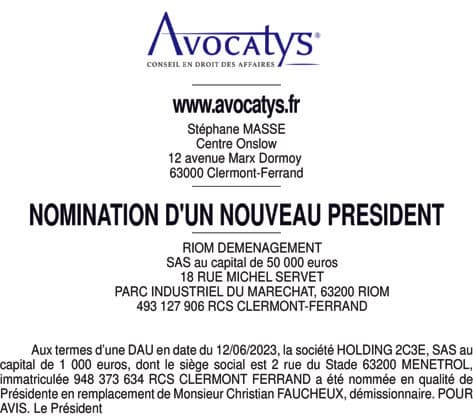 RIOM DEMENAGEMENT - NOMINATION PRESIDENT