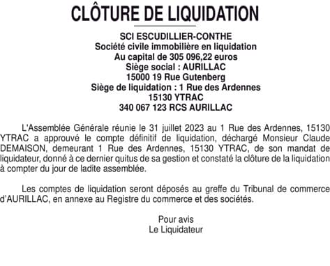 SCI ESCUDILLIER CONTHE - CLOTURE LIQUIDATION