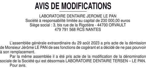 LABORATOIRE DENTAIRE LE PAN - Démission cogérant et modif dénomination