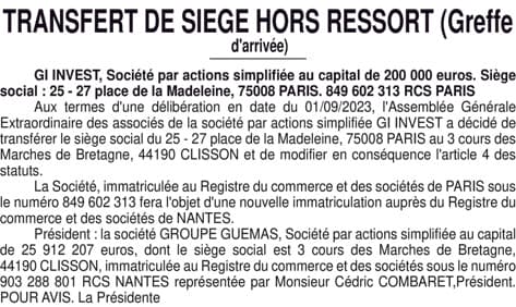 GI INVEST : Transfert de siège