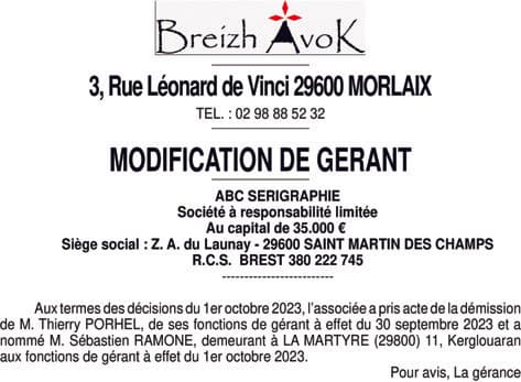 ABC SERIGRAPHIE MODIFICATION GERANT