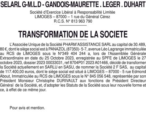TRANSFORMATION SOCIETE PHARM'ASSITANCE