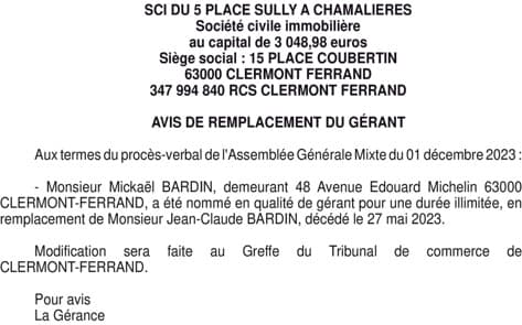 SCI DU 5 PLACE SULLY A CHAMALIERES - Puy-de-dôme (63)
