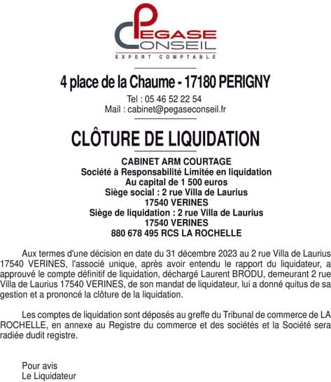 CABINET ARM COURTAGE Liquidation