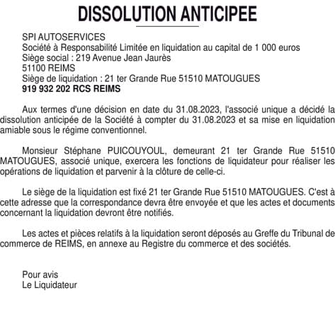 SPI AUTOSERVICES - Dissolution