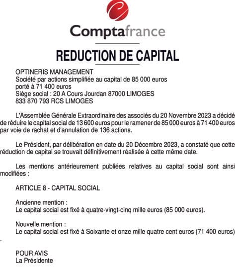 OPTINERIS MANAGMENT REDUCTION DE CAPITAL