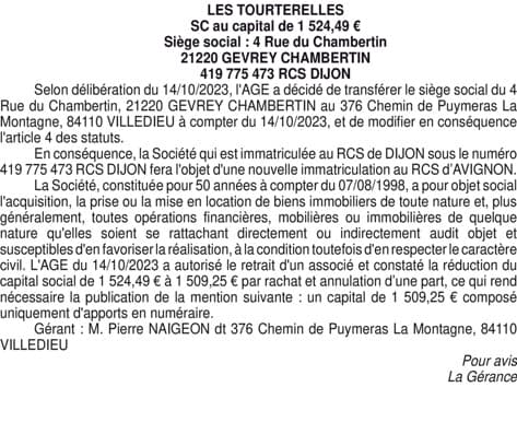 LES TOURTERELLES (transfert siège greffe d'arrivée)