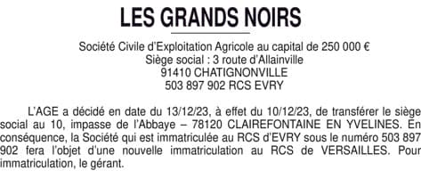 SCEA LES GRANDS NOIRS - transfert de siège social