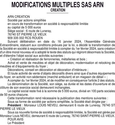 TRANSFORMATION ARN CREATION + MODIFICATION OBJET SOCIAL