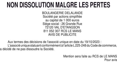 BOULANGERIE DELALANDE - PERTE MOITIE DE CAPITAL