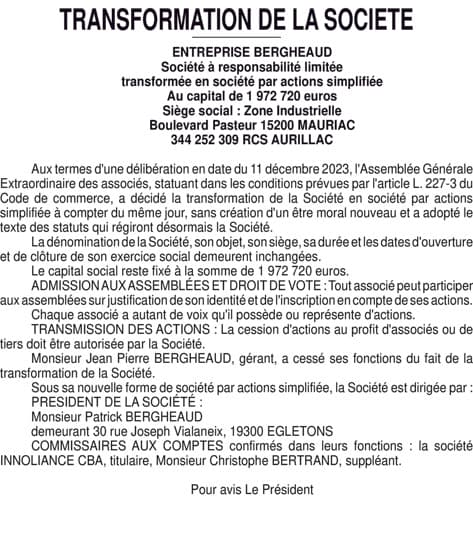 SRL ENTREP BERGHEAUD - TRANSFORMATION EN SAS