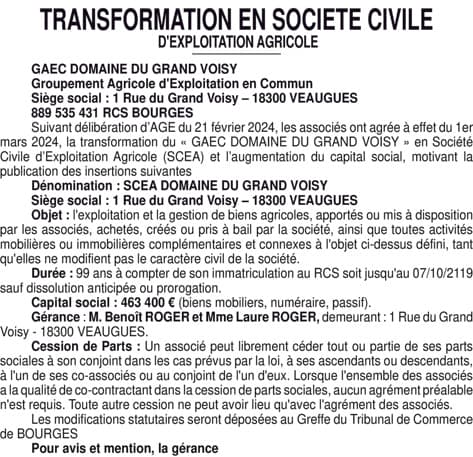 CR18-033667 GAEC DOMAINE DU GRAND VOISY Transformation SCEA
