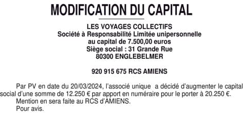 EURL LES VOYAGES COLLECTIFS- MODIFICATION DU CAPITAL