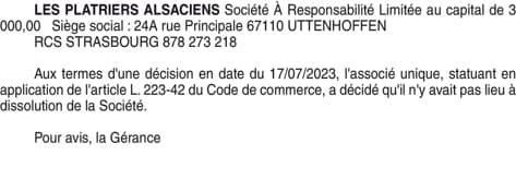 PLATRIERS ALSACIENS / Perte 1/2 du capital