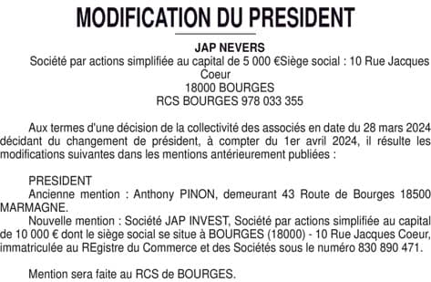 724066 GROUPE JAP (JAP NEVERS CHANGEMENT DE PRESIDENT)