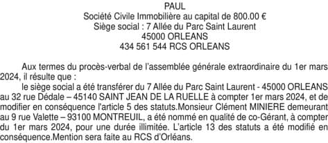 SCI PAUL / Nomination co-gérant + transfert de siège