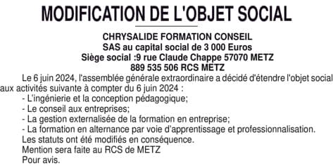 modification de l'objet social CHRYSALIDE FORMATION CONSEIL