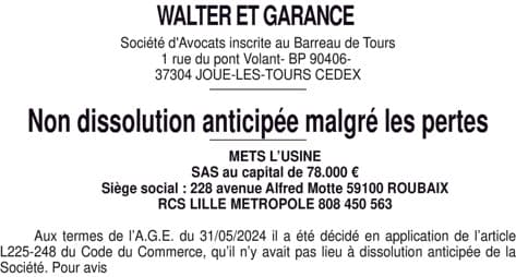SYDC S13879 METS L'USINE perte de moitié de capital