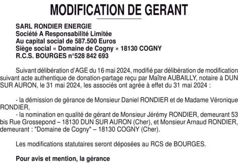 SR 019071 RONDIER ENERGIE Changement gérance