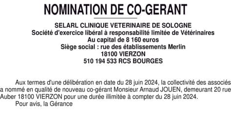 GJ / VG - NOMINATION CO-GERANT CLINIQUE VETERINAIRE DE SOLOGNE