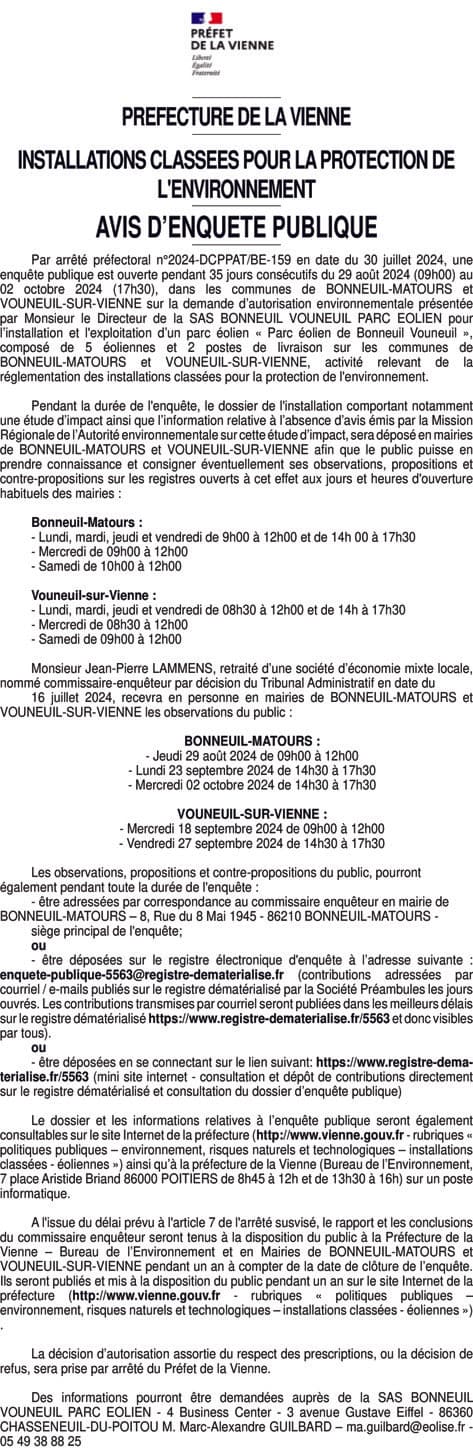 SAS BONNEUIL VOUNEUIL PARC EOLIEN - Vienne (86)