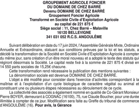 GFA DOMAINE DE CHEZ BARRE - Charente (16)