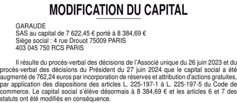 GARAUDE - Augmentation de capital