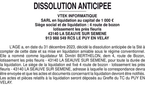 VTEK INFORMATIQUE - DISSOLUTION