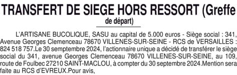 L'ARTISANE BUCOLIQUE - TRANSFERT SIEGE