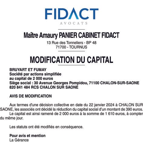 BRUYART ET FUMAY - REDUCTION CAPITAL