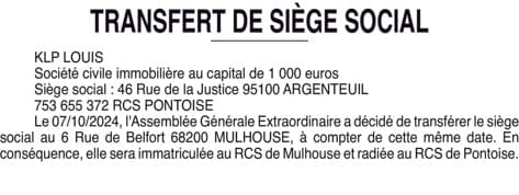 SCI KLP LOUIS - Transfert SS Greffe de départ